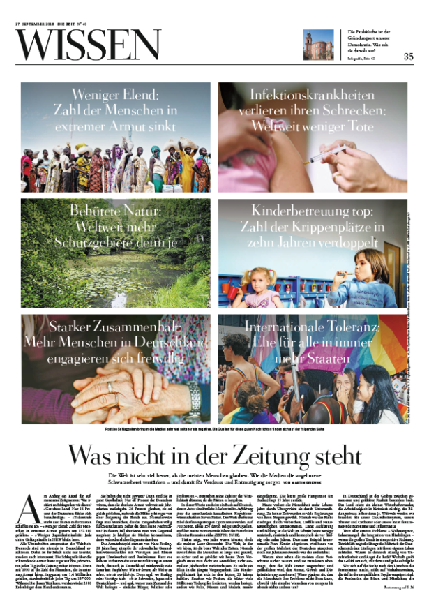 In diesem Artikel beschäftigte sich Wissen- Redakteur Martin Spiewak damit, dass die Welt sehr viel besser ist, als die meisten Menschen glauben. Der Autor hinterfragt, ob Journalisten den gegenwärtigen Pessimismus durch vorwiegend negative Berichterstattung noch verstärken. Er hat auf diesen Text so viele positive Reaktionen be- kommen wie noch auf kein anderes Stück. Die vielen Leserbriefe haben ihn nachdenklich gemacht. Aus vielen Zuschriften sprach geradezu eine Verzweiflung an der Darstellung der Welt in den Medien. Einige sagten sogar, sie schauten keine Nachrichten mehr – aus Selbstschutz. An dem Stück lobten viele Leser, dass der Redakteur selbstkritisch die eigene Berichterstattung reflektiere.