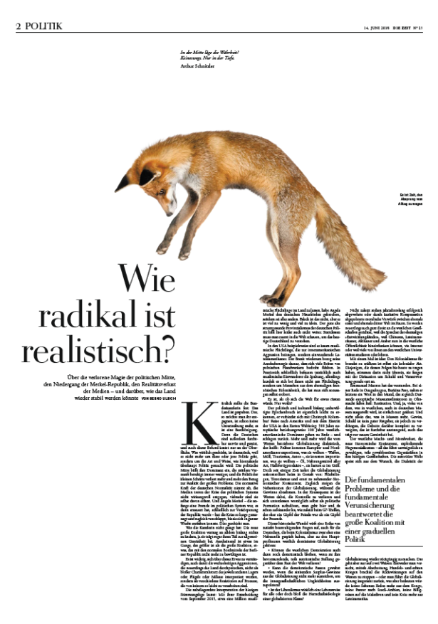Ein Text von Bernd Ulrich über die verlorene Magie der politischen Mitte, den Nieder- gang der Merkel-Republik, den Realitätsverlust der Medien – und darüber, wie das Land wieder stabil werden könnte. Warum blieb dieses Stück positiv in Erinnerung? »Weil es einen besseren Appell an die Vernunft und die Reflexion gar nicht geben kann« oder »weil er die großen politischen und gesellschaftlichen Schieflagen auf den Punkt bringt, erklärt und konkrete Lösungsvorschläge macht«, so schrieben zwei von Ihnen in ihren Begründungen.